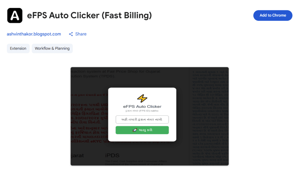eFPS Auto Clicker (Lite Version) એ ગુજરાતના સસ્તા અનાજના દુકાનદારો (FPS Dealers) માટે ખાસ બનાવવામાં આવેલું સુપર-ફાસ્ટ અને એકદમ હળવું (Lightweight) એક્સ્ટેન્શન છે. જે દુકાનદારોને સ્ટોક કે માસિક પત્રકની ઝંઝટમાં નથી પડવું અને માત્ર “ફટાફટ બિલ જ ફાડવા છે”, તેમના માટે આ એક્સ્ટેન્શન આશીર્વાદ સમાન છે. આ એક્સ્ટેન્શન તમારો કિંમતી સમય બચાવશે અને ગ્રાહકોની લાઈન ફટાફટ પૂરી કરવામાં મદદ કરશે.