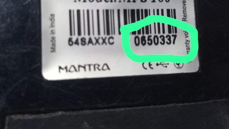 mantra ડિવાઇસ પાછળ આ રીતે સ્ટીકર લગાવેલું હશે જેમાં સિરિયલ નંબર ઉપરના ફોટા મુજબ દેખાતો હશે આ સિરિયલ નંબર ફોર્મ માં નાખવો અને આ રીતે ડિવાઇસ ના પાછળ નો ફોટો પાડીને અપલોડ કરવો